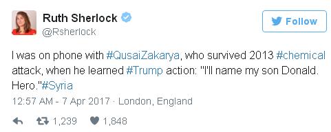 «Estuve hablando con #QusaiZakarya, quien sobrevivió al ataque #chemical en 2013, cuando ella supo de la acción de trump: «Yo llamaré a mi hijo Donald. Héroe». #Syria