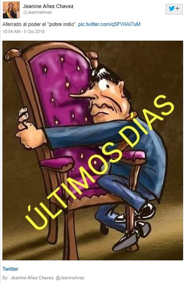 También circulan capturas de un tuit del 5 de octubre de 2019 en el que Áñez califica al entonces presidente de Bolivia Evo Morales de «pobre indio» «aferrado al poder», junto a una ilustración del mandatario abrazado a una silla.
