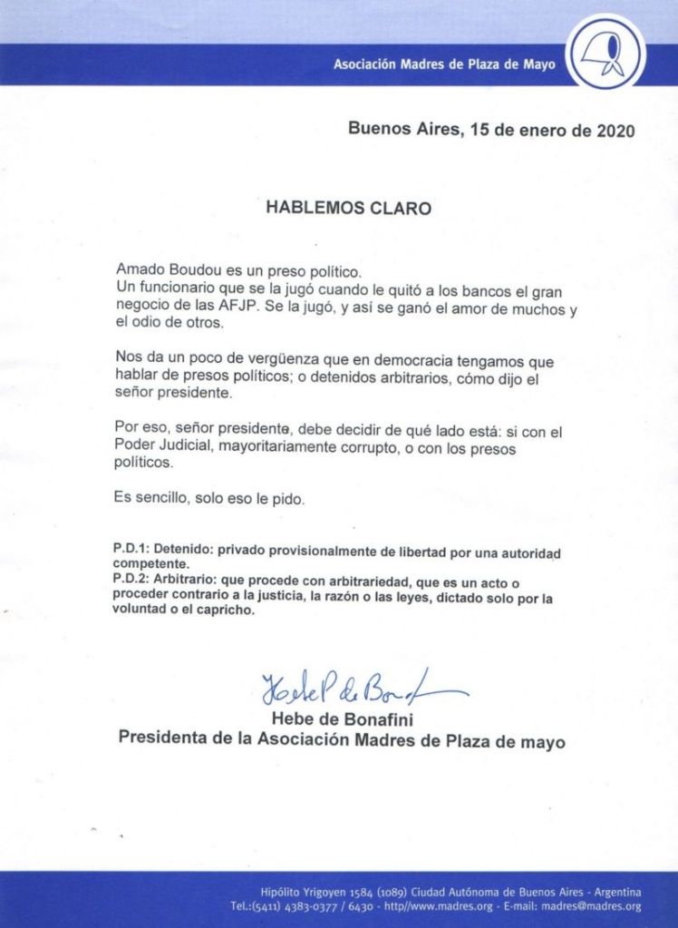 El golpe más duro lo recibió hoy Alberto de la titular de Madres de Plaza de Mayo, Hebe de Bonafini, quien en la página de la organización le pidió saber “de que lado está”. Mencionó puntualmente a Boudou como “un preso político, que se la jugó cuando le quitó a los bancos el gran negocio de las AFJP… y así se ganó el amor de muchos y el odio de otros”.