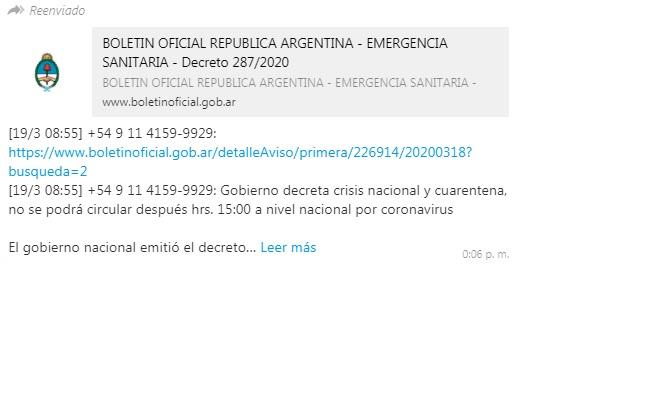 El coronovirus nos tiene a maltraer. Pero hay espacios para idiotas que hacen circular noticias falsas y graves por las redes. Hace un par de días, se alertaba por WhatsApp (con la exhortación de difundir), que helicópteros de la Fuerza Aérea iban a fumigar la ciudad de Buenos Aires y sus alrededores, por lo que había que encerrarse en las viviendas y bajar las persianas a partir de las 11 de la noche. Falso, de falsedad absoluta. Hoy, esta tarde, mientras el Gobierno se preparaba para definir la rigidez de la cuarentena, apareció un boletín oficial igual de trucho con características insólitas de la medida en estudio por el presidente Alberto Fernández y su equipo de colaboradores. Otra falacia total para crear desbordes y pánico, igual que situaciones enojosas que se vienen dando en distintos centros asistenciales por falta de vacunas para la gripe y el atosigamiento de la gente en esos lugares. Con casos de furia. Ayer, en Vacunar de Luis María Campos al 700, la multitud agolpada quiso romper las vidrieras del local. Desde hoy, todo es con turnos previamente solicitados por Internet.