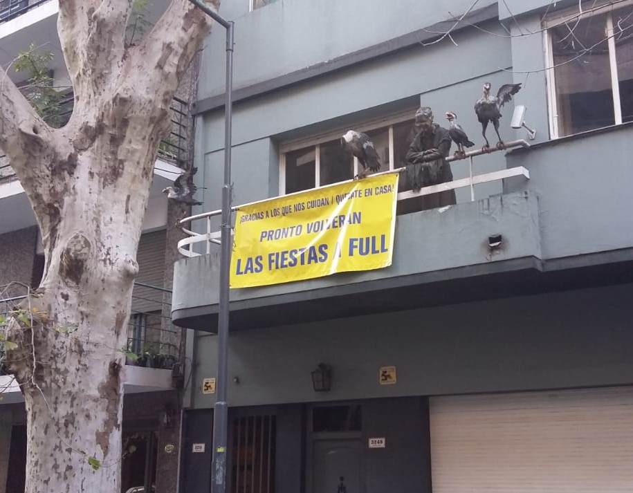 “Quedate en casa, pronto volverán las fiestas a full”, dice el cartel situado en un balcón porteño. ¿Tanto importa la joda? ¿O lo que importan son los afectos?