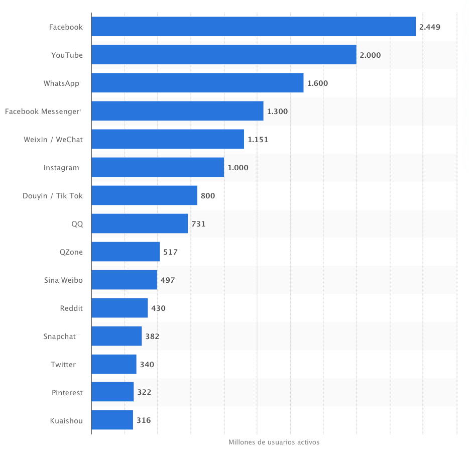 Una persona, en promedio, descarga muchas aplicaciones en su teléfono. Algunas las conserva, otras las deshecha. A principios de 2020, Statista – un portal alemán de estadísticas en línea que procesa datos de estudios de mercado y de opinión -, actualizó su ranking de las principales redes sociales a nivel mundial, según el número de usuarios activos, en millones. Merced a la gentileza de WINN (Women in de News Network, Humanidad lo pone a disposición de sus lectores.