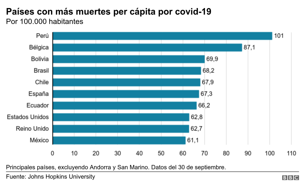 La pandemia de covid-19 ya se cobró más de un millón de vidas. Exactamente 1.008.842, según datos del 30 de septiembre de la Universidad Johns Hopkins en Estados Unidos., según informó BBC News Mundo. No figura en el ránking de los 10 primeros la Argentina, pero sí 6 países de América Latina, Perú, Bolivia, Brasil, Chile, Ecuador y México.