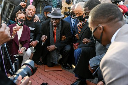 Familiares y letrados de George Floyd, se arrodillaron hoy durante 8 minutos y 46 segundos, el tiempo que el expolicía Dereck Chauvin apretó su rodilla contra el cuello del afroamericano hasta matarlo, en el comienzo del juicio oral que se celebra ante la Corte norteamericana de Minneápolis, por le asesinato ocurrido a plena luz del día el 25 de mayo de 2020.