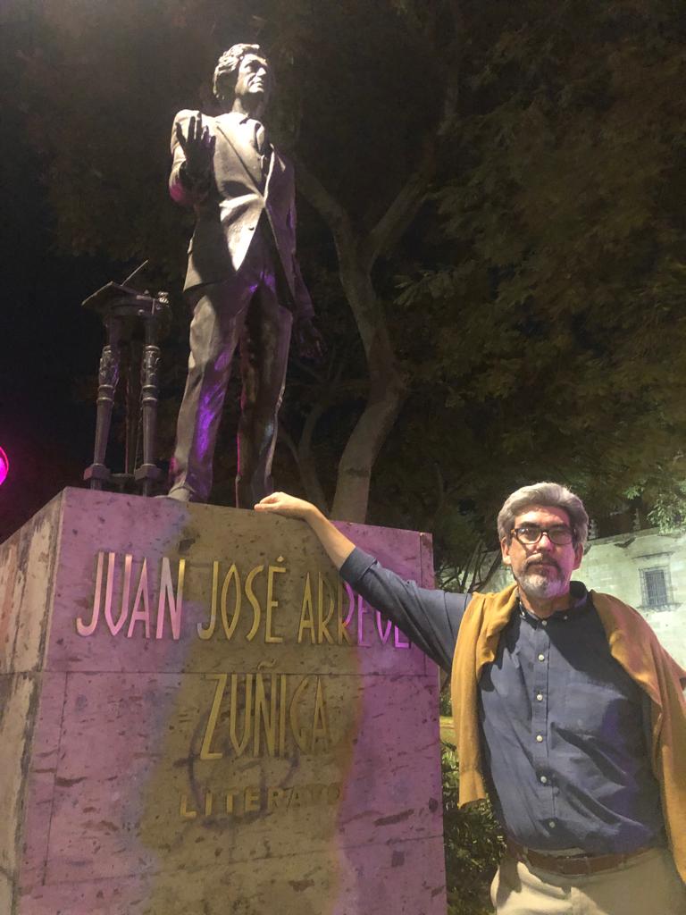 Recorro la plaza que acoge sus estatuas, busco sus nombres, son mis amigos, cariño inalterable, en tanto sobreviene la catarata de recuerdos. La prosa, los cuentos, los poemas leídos y releídos; El guardagujas, y la Parábola del trueque de Juan José Arreola, con su aguda sátira, los estremecedores poemas Ciego Dios y El Cristo de Temaca de Alfredo R, Placencia, La bellísima e inolvidable Parábola del huésped sin nombre de Enrique González Martínez, y el profundo retrato que de mi pueblo hace en Al filo del Agua el inconmensurable Agustín Yáñez.