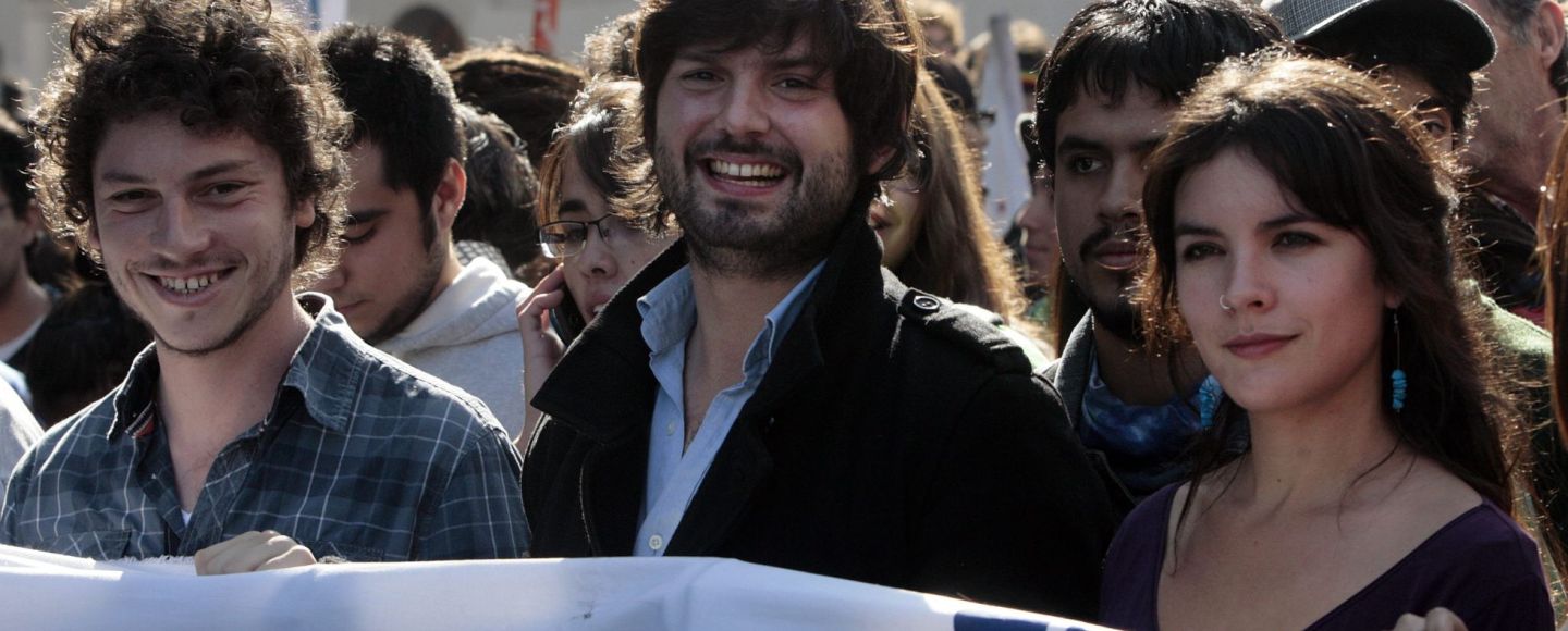 - Imagen destacada: Los entonces líderes estudiantiles Noam Titelmann (izquierda), Gabriel Boric (centro), y Camila Vallejo (derecha) participan en una marcha el miércoles 16 de mayo de 2012 en el centro de Santiago de Chile.