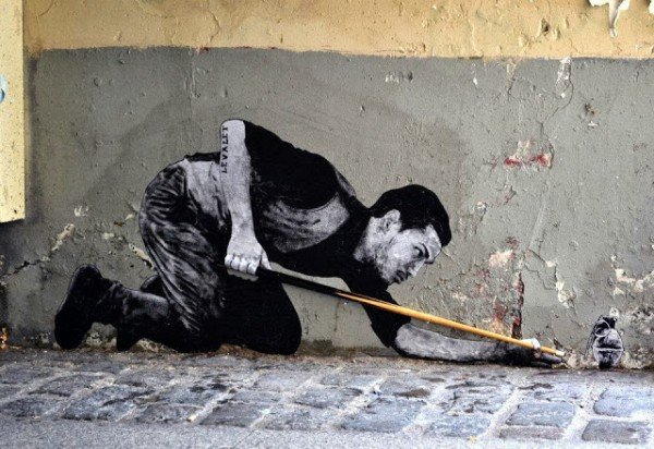 Utilizando las calles de París como su patio, el artista Charles Leval (1988), Levalet, deleita – o no, a juzgar por algunos comentarios en las redes sociales -, con sus personajes que interactúan inteligentemente con el entorno.