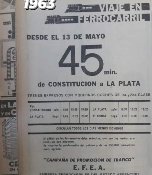 Parece sacado de la película «Volver al Futuro» pero a la inversa. En realidad se trata de volver «al pasado» porque a comparación con el presente, esa época ya histórica parece futurista. Una publicidad gráfica compartida en Twitter muestra como se anunciaba con enorme tipografía que el Tren Roca expreso que unía a La Plata con Plaza Constitución demoraba apenas 45 minutos, algo impensado al día de hoy, seis décadas más tarde.
