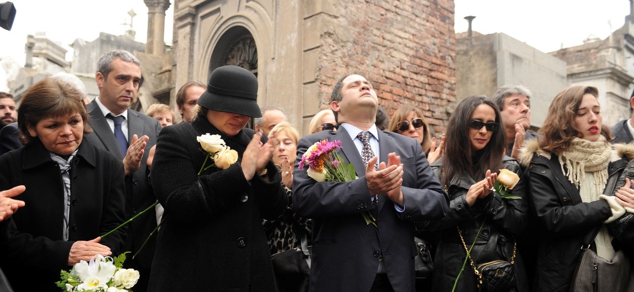 - Imagen destacada: Marcela y Felipe Noble Herrera junto a familiares y amigos en la ceremonia de despedida de Ernestina Herrera de Noble en Recoleta. (Maxi Failla), a mediados de junio de 2017.