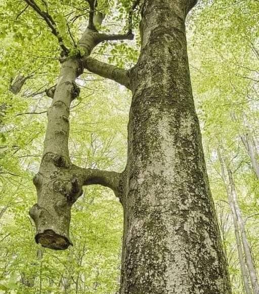 El árbol más delgado fue cortado hace años y el grande lo ha estado sosteniendo y alimentando desde entonces. Se «despiertan» juntos en primavera y «se duermen» juntos en otoño.
