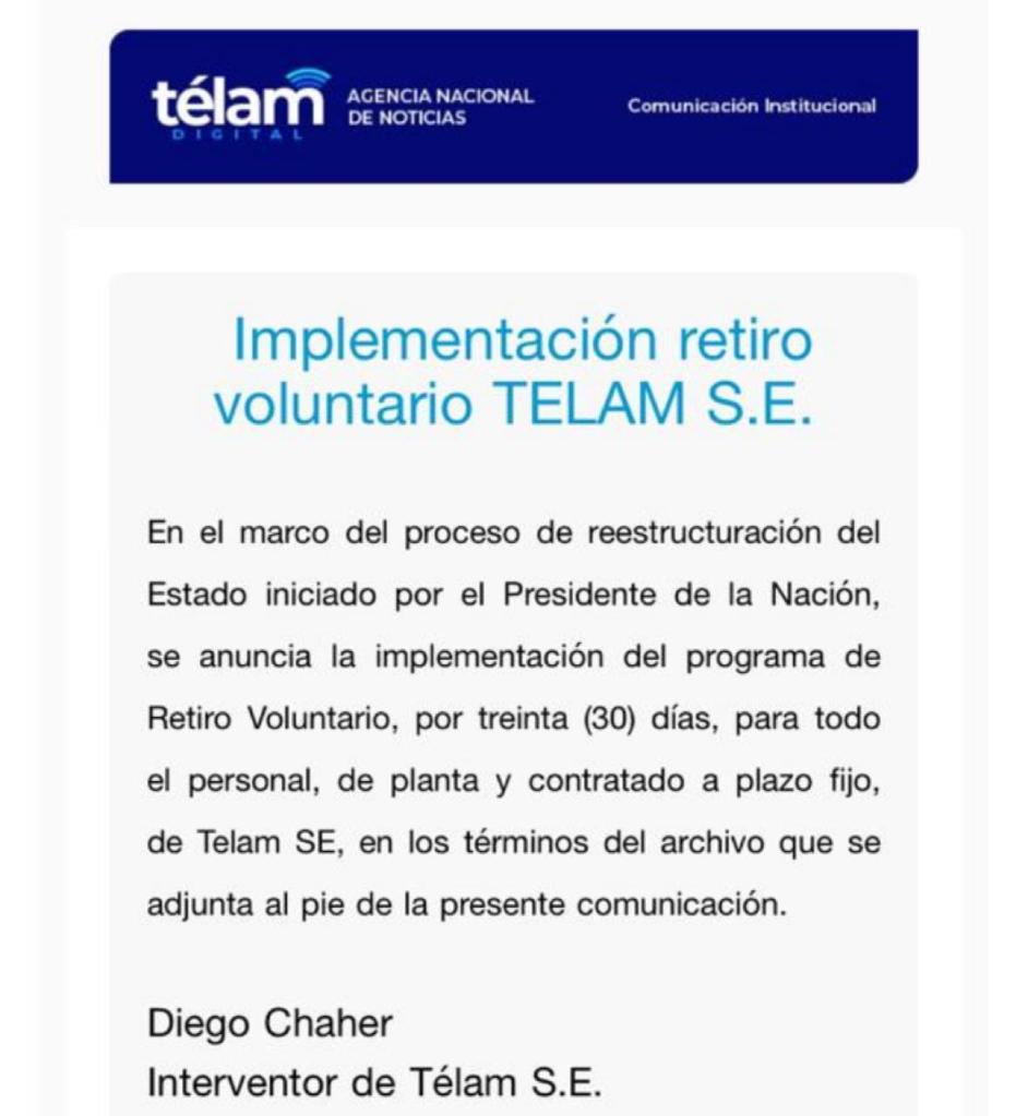 Al tiempo que extendió «la dispensa laboral» por una semana más a partir de mañana, lunes, el interventor de la agencia Télam Sociedad del Estado (SE), envió esta noche cartas documentos al personal, unas 750 personas, comunicando que se abre un registro de retiros voluntarios por 30 días, según la información exclusiva a la que accedió Humanidad.