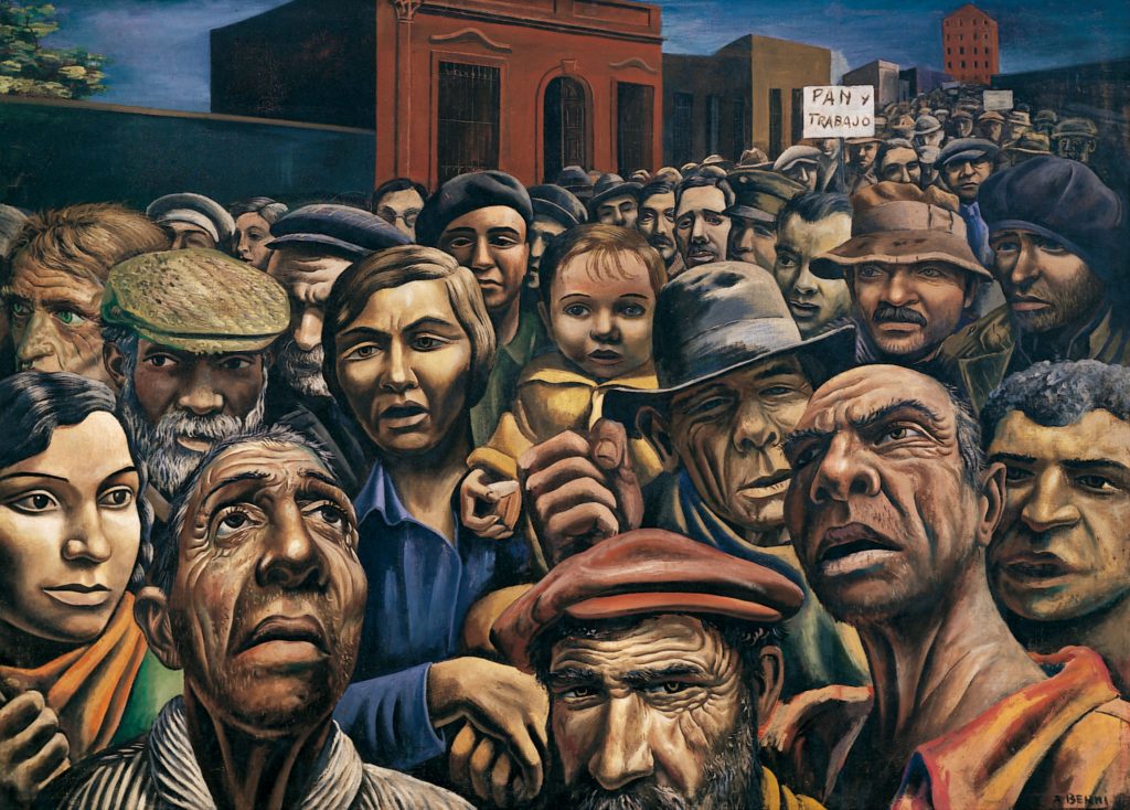 La histórica obra del legendario pintor rosarino muestra un conjunto uniforme de personas, la mayoría con rostros de preocupación. Berni denunció a través de su arte la profunda desocupación social y crisis argentina tras los años treinta.