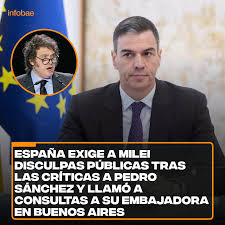 El gobierno de España exigió que el presidente Javier Milei se disculpe públicamente por llamar «corrupta» a la esposa del presidente Pedro Sánchez, y anunció que llamará a consultas «sine die» a su embajadora en Buenos Aires.