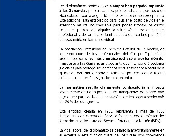 Formalmente, el enojo se tradujo en un comunicado de la Asociación Profesional del Servicio Exterior de la Nación (APSEN), rechazando la reglamentación del impuesto a las ganancias (hoy denomidado Impuesto a los Ingresos Personales), que eliminó la exención que regía para los diplomáticos en misiones externas.