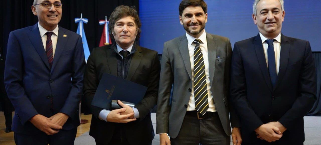 - Imagen destacada: Milei posó solo para la foto con Simioni (aplaudido de pie), el gobernador Pullaro y el intendente Javkin.