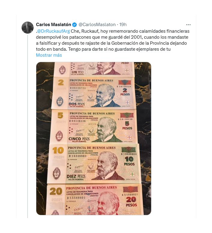 «Hoy, rememorando calamidades financieras, desempolvé los patacones que me guardé del 2001, cuando los mandaste a falsificar y después te rajaste de la Gobernación de la Provincia dejando todo en banda”, tuiteó Carlos Maslatón, criticando a Carlos Ruckauf, en una especie de conmemoración de los famosos bonos que se volvieron un emblema de los años de crisis en 2001-2002.