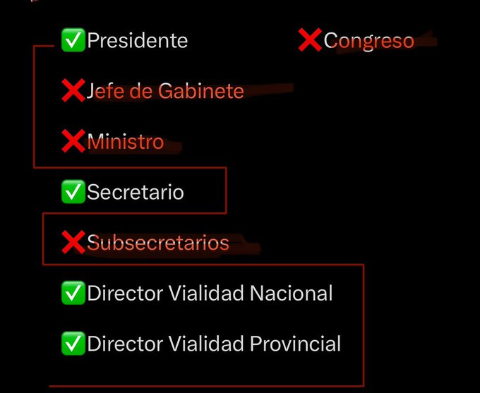 En la imagen que acompaña el tuit del senador nacional, se indica con un tilde a los afectados por el fallo de Casación, y con una “X” a quienes no fueron condenados. La lista sigue la cadena de mando respecto a la administración de la obra pública, listando: Presidente, Jefe de Gabinete, Ministro, Secretario, Subsecretarios, Director Vialidad Nacional, Director Vialidad Provincial, Congreso.
