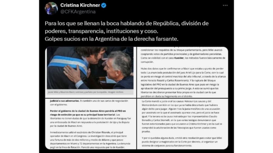 «Para los que se llenan la boca hablando de República, división de poderes, transparencia, instituciones y coso. Golpes sucios en la Argentina de la derecha farsante», posteó este sábado Fernández de Kirchner en su cuenta de X.
