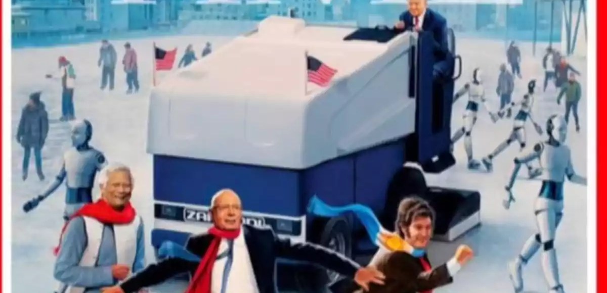 En la ilustración aparece en un centro de patinaje junto a otros líderes mundiales, como el reciente presidente electo de Estados Unidos Donald Trump; Klaus Schwab, presidente ejecutivo del Foro Económico Mundial; Muhammad Yunus, premio Nobel de la Paz bangladesí, y Ngozi Okonjo-Iweala, economista y directora de la Organización Mundial del Comercio.