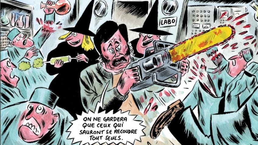 En la caricatura que ilustra la nota, el mandatario aparece atacando a científicos con una motosierra y diciendo: “Solo nos quedaremos con los que sepan curarse solos”.