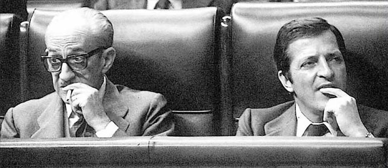 Vuelvo a una imagen de la grabación: de pie, con los brazos caídos a los costados y desafiando a los seis guardias civiles que acribillan el hemiciclo del Congreso, el general Gutiérrez Mellado – tanto como querer impedir la entrada de los rebeldes en el recinto, tanto como querer someter el poder militar al poder civil -, parece querer proteger con su cuerpo el cuerpo de Adolfo Suárez, sentado a su espalda en la soledad de su escaño de presidente. Esa imagen es otro resumen o emblema: el emblema o resumen de la relación entre esos dos hombres.