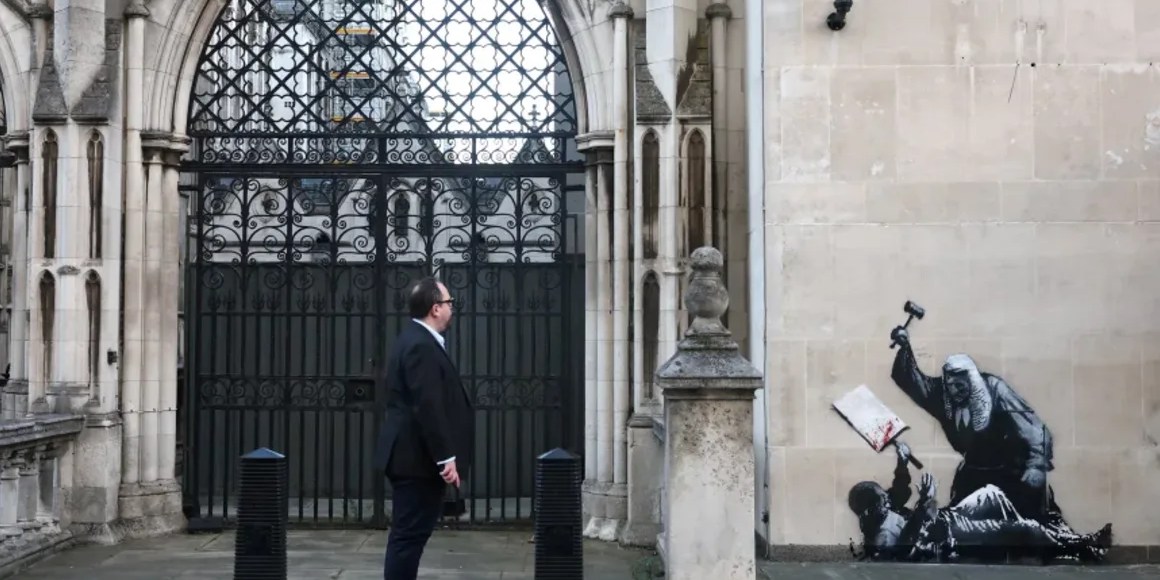 El mural que representa a un magistrado golpeando a un manifestante, del artista conocido como Bansky (quien nunca ha revelado públicamente su identidad y es crítico de de las políticas gubernamentales del Reino Unido sobre inmigración y guerra), fue eliminado de la pared de los icónicos Tribunales Reales de Justicia de Londres.