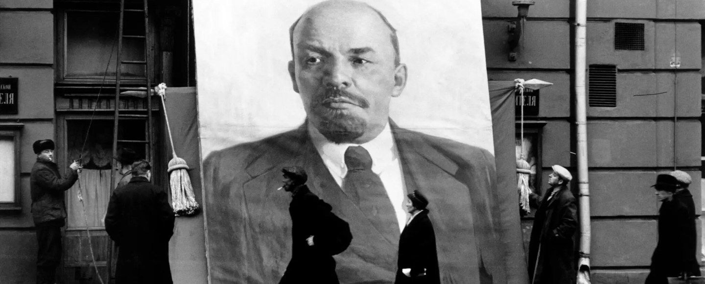 - Imagen destacada: personas vestidas de negro caminando y en torno a una imagen en gran formato de Vladimir Lenin.Credit…Elliott Erwitt/Magnum Photos