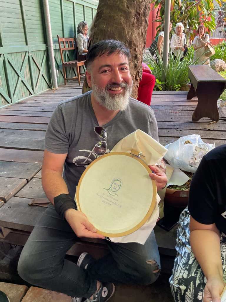 -…La idea de estos rostros y nombres tienen que ver con consignas que teníamos en esa época que eran contra el imperialismo y la gran mayoría por el socialismo; también había grupos peronistas, que querían cambios estructurales. Se habla de todo lo que hicieron esos compañeros y a raíz de eso traemos a cada uno. Evocamos el derrotero de cada compañero y de cada desaparecido; y por ahí pueden darse cuenta que fueron períodos de gran movilización de insurgencias obreras populares, sindicales, estudiantiles; luchábamos por un país sin explotadores ni explotados Tratamos de no olvidar. No solo de no olvidar a los desaparecidos sino de no olvidar las ideas revolucionarlas que hay que debatirlas un poco más: hacia dónde vamos, que es lo que queremos, qué es lo que quiere este país, qué es lo que queremos entre todos. Somos un grupo que venimos bordando luchas de ayer y hoy hace varios años, desde la pandemia, en varias provincias (anoche llegaron 146 paños de Jujuy, para que «no falte ni unito en este enhebrado de agujas y emociones») . Acá, en Buenos Aires, tomamos la idea de hacer un rollo con los nombres de los desaparecidos…