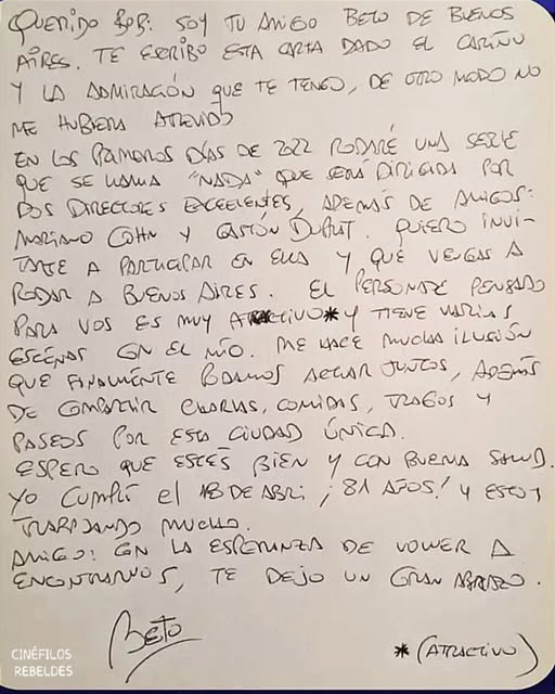 “Querido Bob: Soy tu amigo Beto de Buenos Aires. Te escribo esta carta dado el cariño y la admiración que te tengo; de otro modo no me hubiera atrevido. En los primeros días de 2022 rodaré una serie que se llama ‘Nada’, que será dirigida por dos directores excelentes, además de amigos: Mariano Cohn y Gastón Duprat. Quiero invitarte a participar en ella y que vengas a rodar a Buenos Aires. El personaje pensado para vos es muy atractivo y tiene varias escenas con el mío. Me hace mucha ilusión que finalmente podamos actuar juntos, además de compartir charlas, comidas, tragos y paseos por esta ciudad única”, escribió Brandoni, y agregó: “Espero que estés bien y con buena salud. Yo cumplí el 18 de abril ¡81 años! Y estoy trabajando mucho. Amigo: en la esperanza de volver a encontrarnos, te dejo un gran abrazo. Beto”.