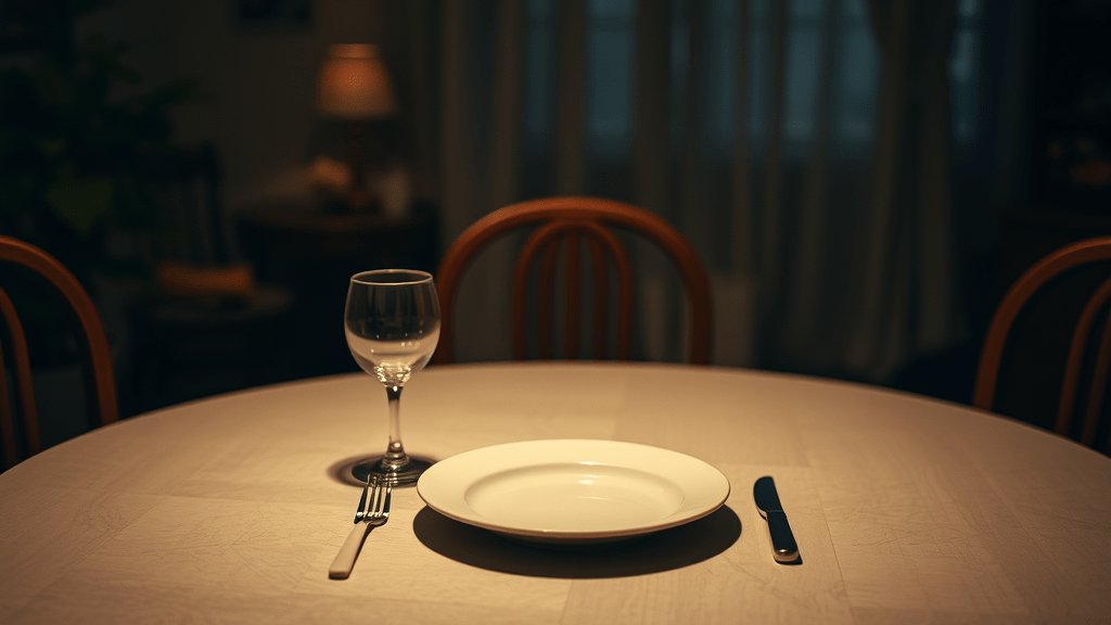 Una madre con hijos independizados no puede dejar de sufrir las noches solitarias. El momento crucial es aquel en el que se encuentra con el plato de comida, fuente de sustento para seguir, y a la vez fuente de ahogo.